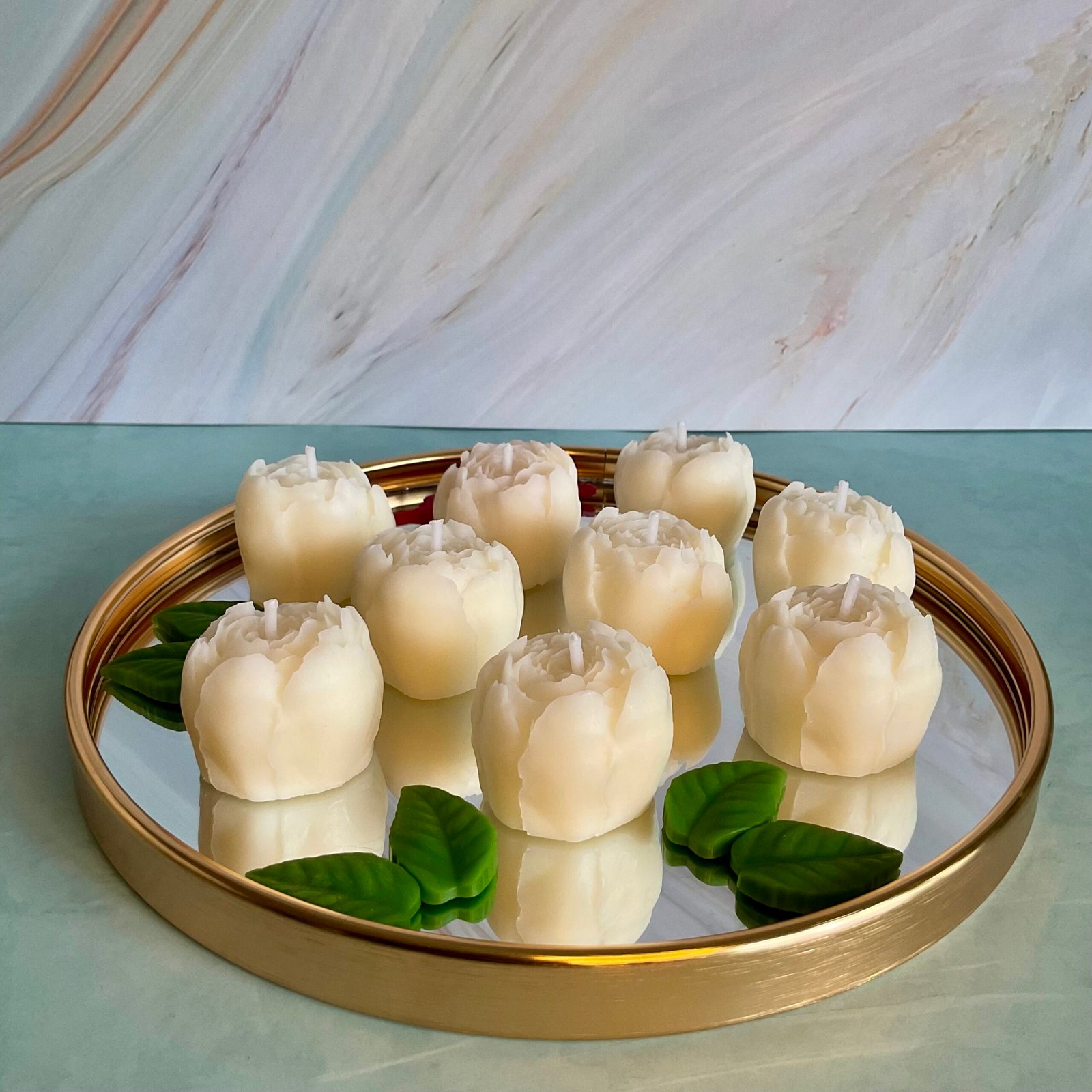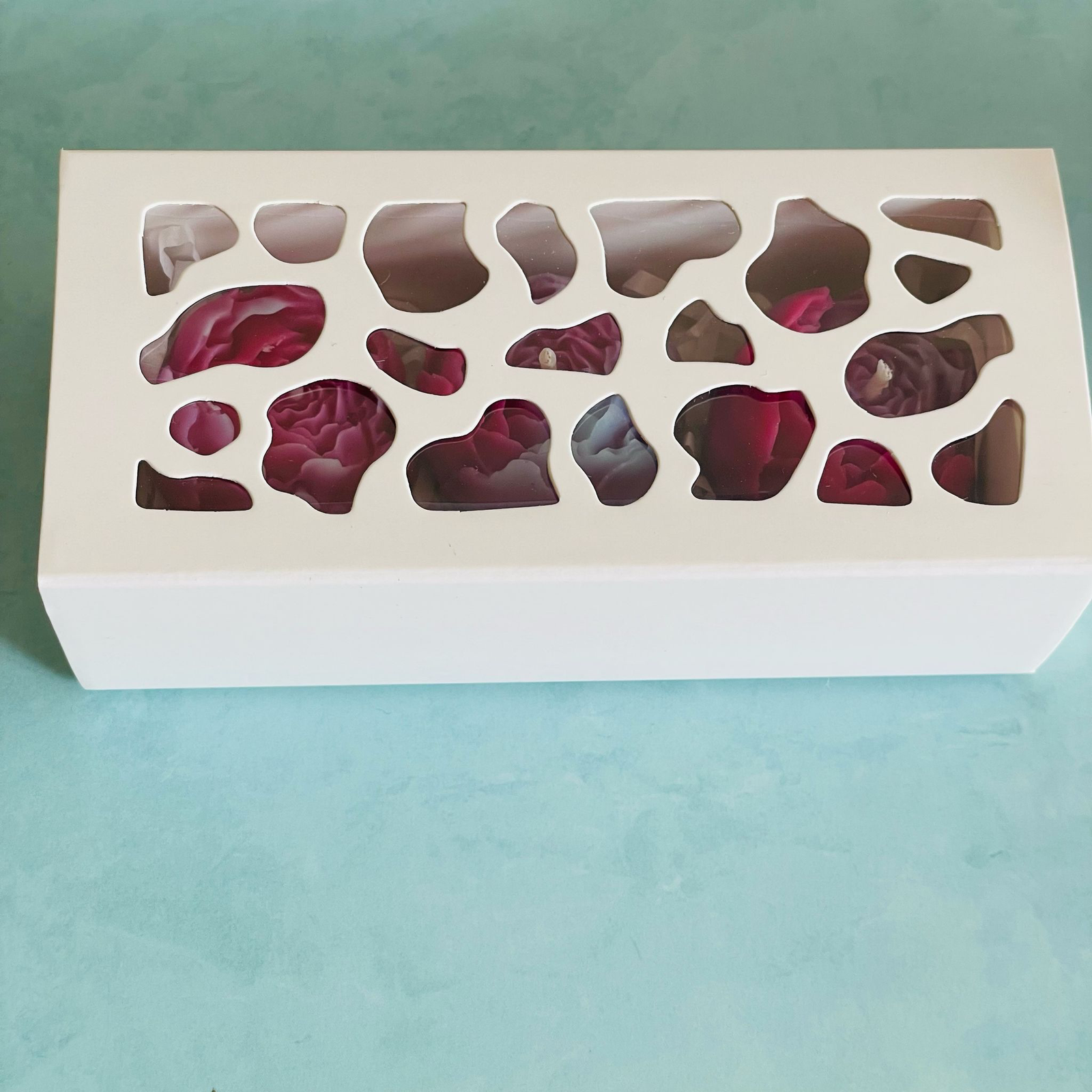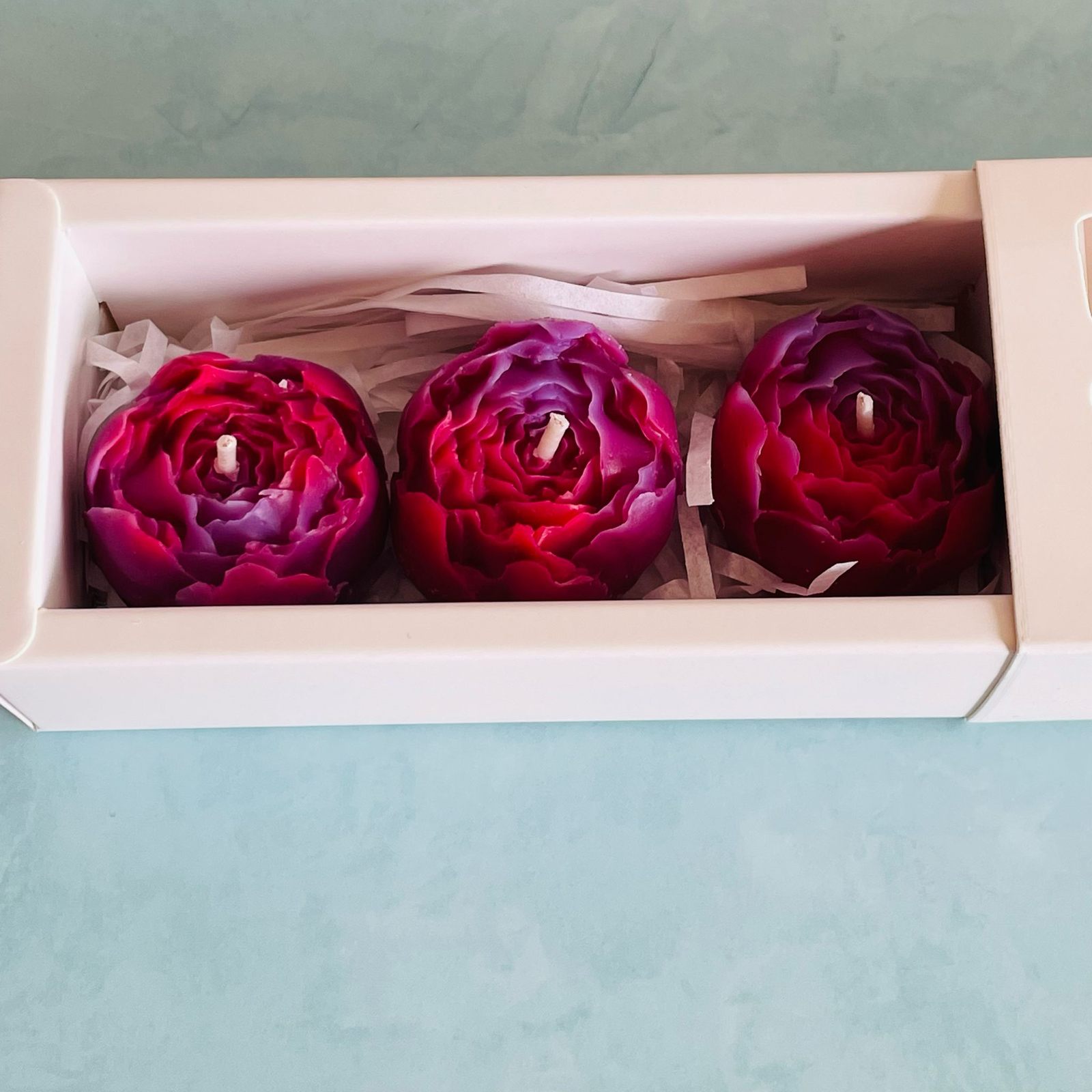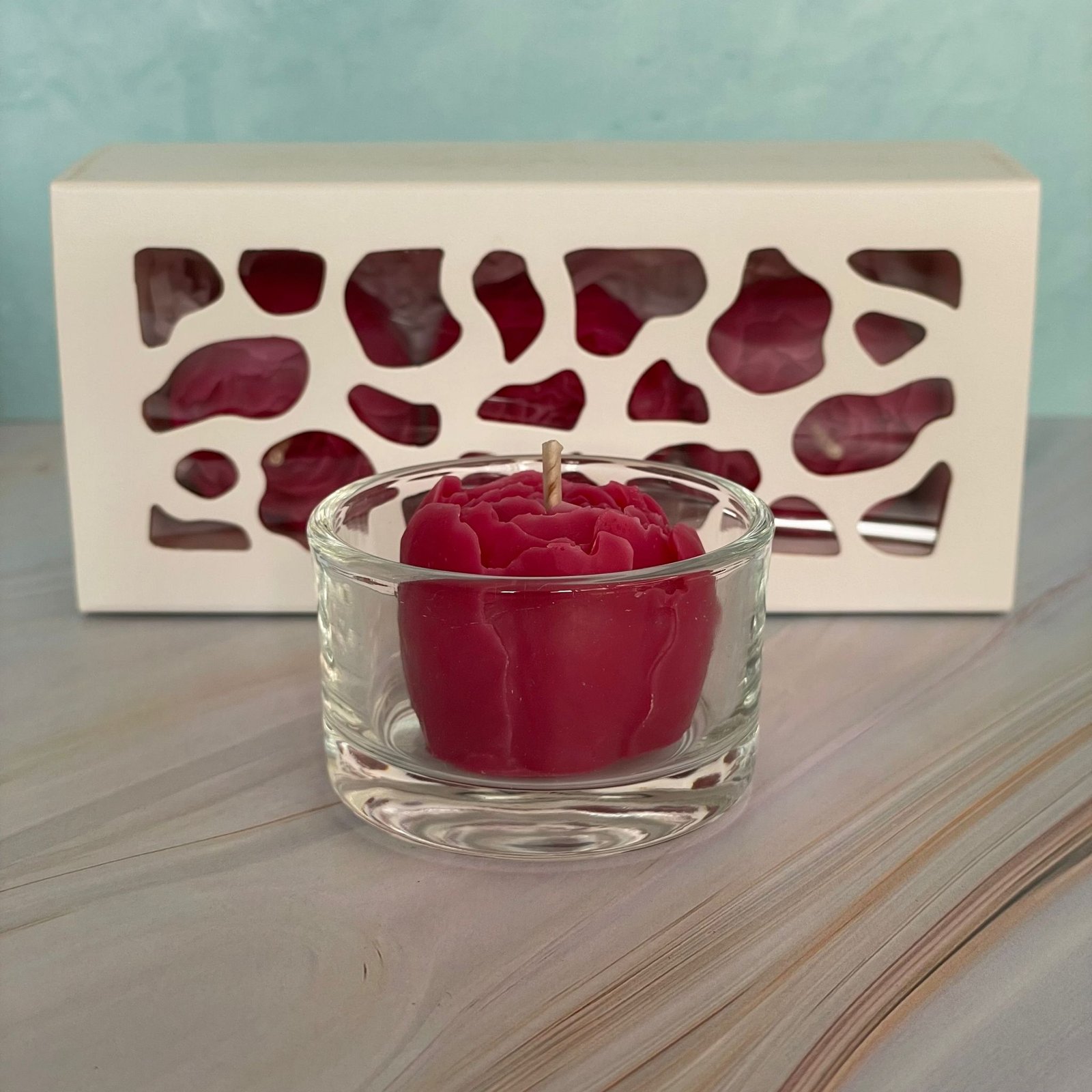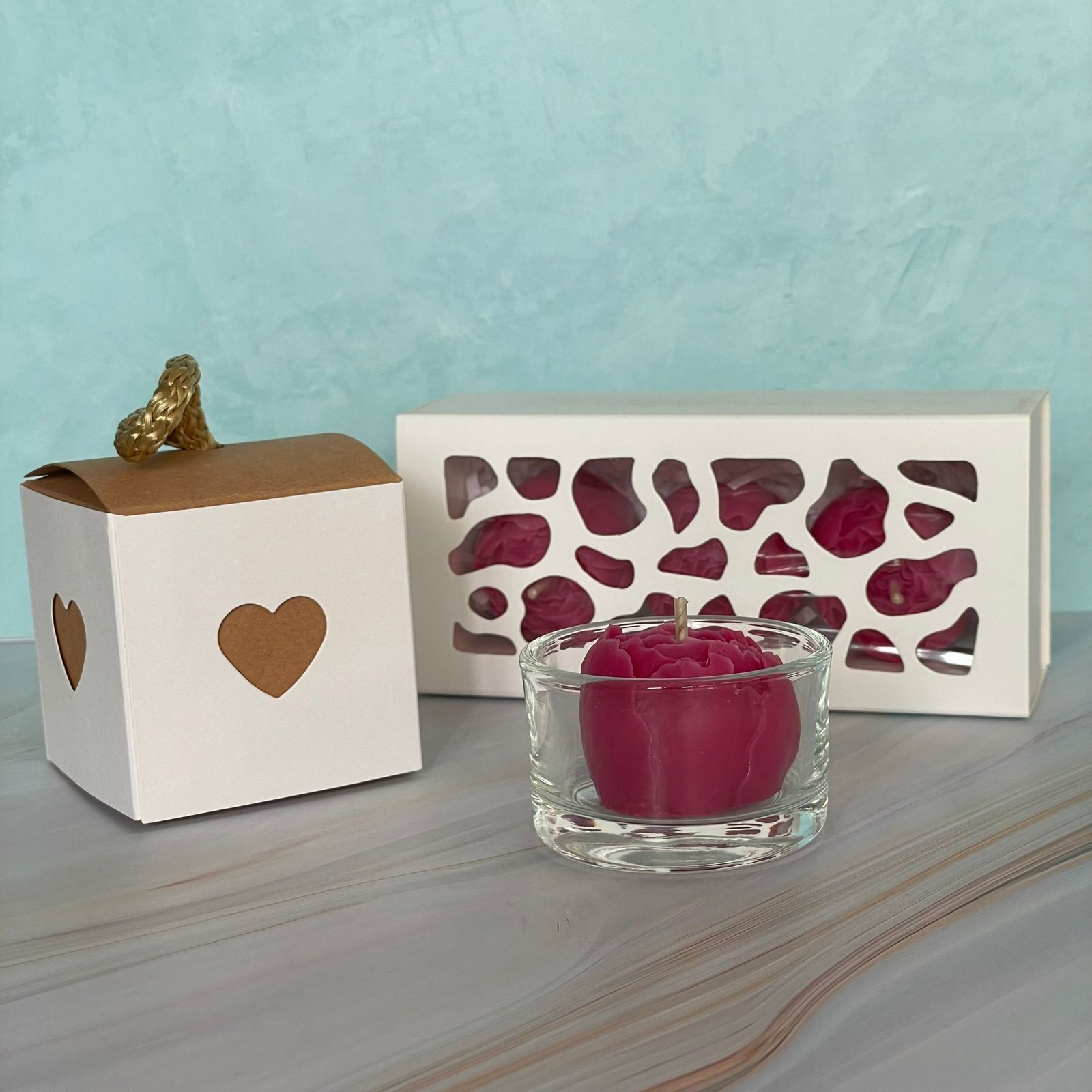 Conține 3 bujori ambalați în cutie și un bujor într-un recipient de sticlă, ideal pentru ardere.