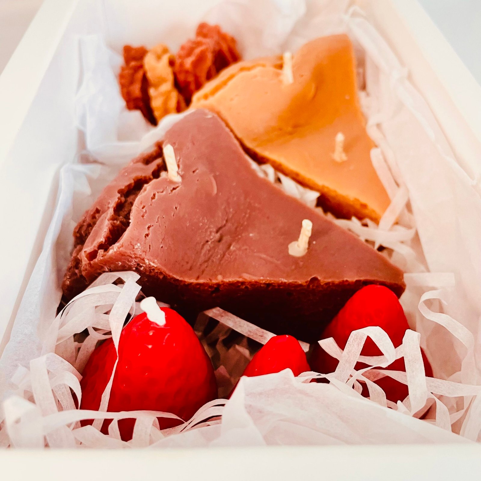Pentru a completa decorul și atmosfera, am inclus și wax melts fursecuri sau praline și căpșunici plus încă o căpșunică pe care poți să o aprinzi.