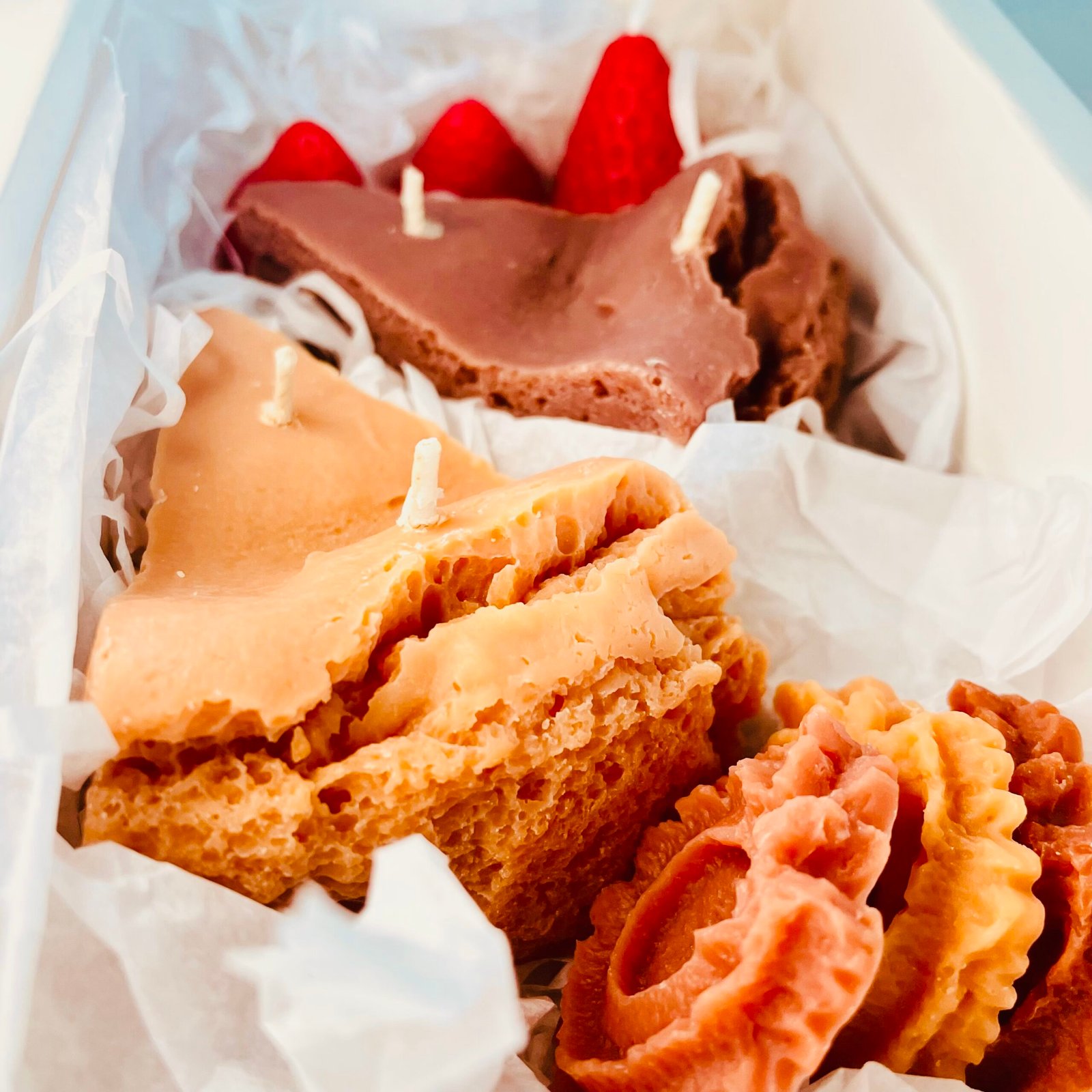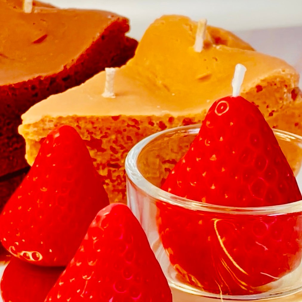 Lumânările sunt din ceară naturală de cocos și imită perfect forma unor felii de prăjitură.